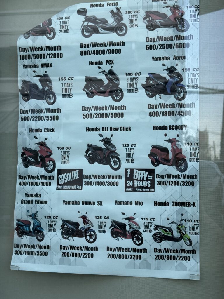 安い(ボロい)バイクだと、3日で400バーツくらいです。どれくらいボロいかというと、色褪せているだけでなくメーターが動かずバックパネルのライトが死んでて、前後サスもなんか動く棒くらいの状態でした。「メーター動かねぇんだけど?」と旦那さんに聞いたらちょっといじってみて、「すぐに直んねぇわ」と言われて、その3ヶ月後に行っても直ってない。気にしたらアカン。安くて親切なのでOKです。価格表と色褪せバイクも載せておくのでご参考まで。